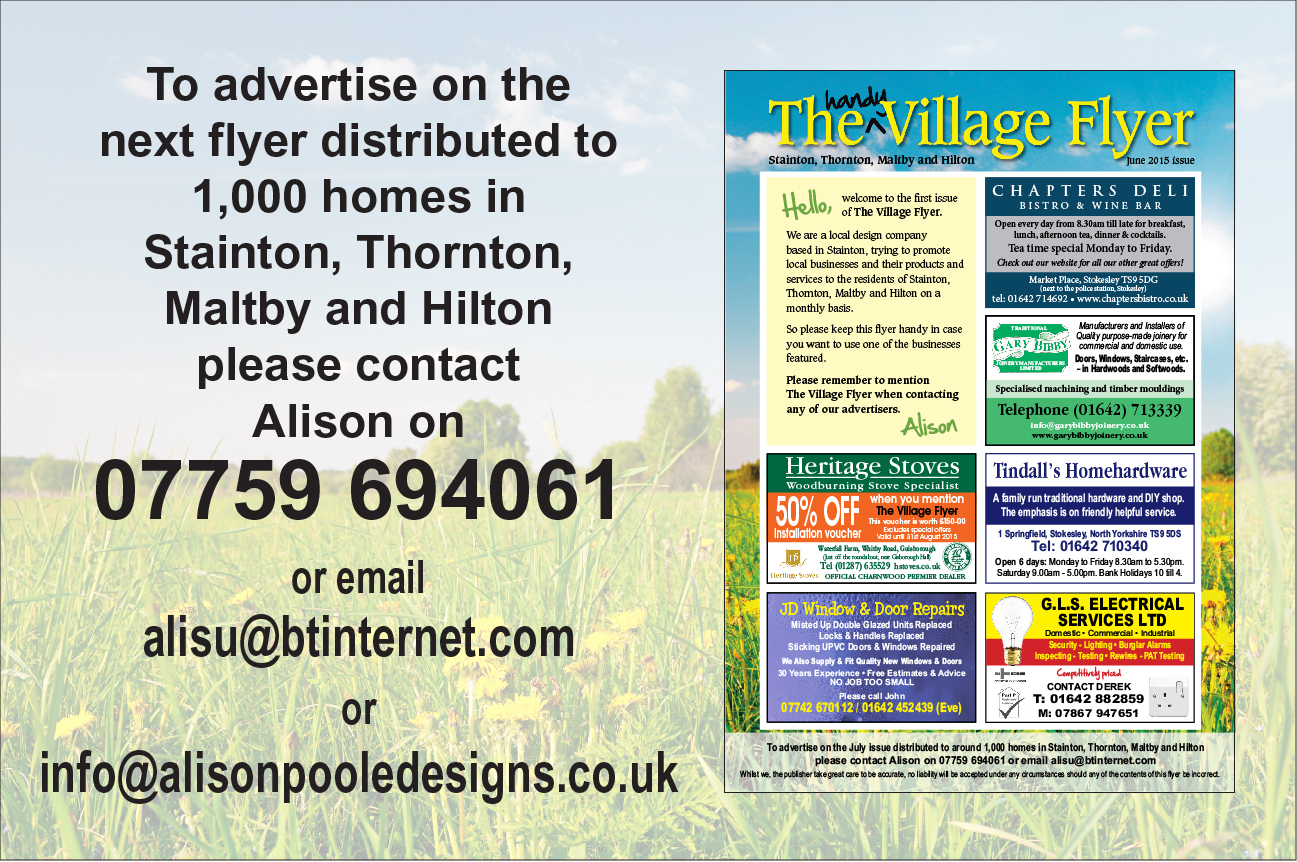 The handy Village Flyer is a regular, bi-monthly A5 flyer building familiarity and loyalty within the community. It is designed and delivered by alisonpooledesigns to approximately 1000 homes in Stainton, Hilton, Thornton and Maltby.